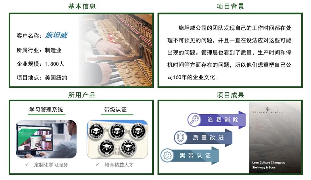 在这样的背景下,施坦威选择了与汉灞学院合作,开始了他们的精益转型之旅。汉灞学院作为一家专业的精益管理在线学习平台,为施坦威提供了全面的精益知识和技能培训。通过这一合作,制造团队和员工不仅掌握了流程管理技能,还学会了如何识别和消除生产中的致命浪费。管理层也看到了质量评分、生产时间以及停机时间的显著改善。